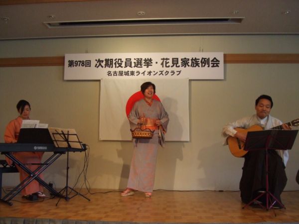 引き続いて第2部に移りL鍋野が開会の挨拶をし、アトラクション・春のコンサート「花づくし」と題してソプラノ歌手内田公仁子、ピアノ笹原直美、ギター・テノール田中良夫による「さくらさくら」を始め8曲が歌われ素晴らしかった。アンコール曲「菜の花畑」を全員で懐かしく合唱した。