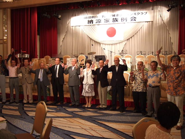 ドネーションファインの集計報告、L加藤(文)のライオンズロアー、「また会う日まで」を手を取り合って合唱、L鬼頭によって閉会の挨拶とゴング。納涼にふさわしい楽しいひとときでした。