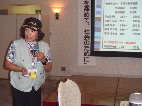そして、本日のゲストあいち防災リーダー会の太田貴代子様による「自分の命は自分で守る」について災害時の自主防災の大切さを、いくつかの事例を紹介されながら非常に熱く語っていただきました。いつ起こるか分からない災害に備えて、出来ることを確認すること。@家族との約束、連絡方法、A隣近所との協力、B家具類の固定、C非常持ち出し品の確認等、自分の命は自分で守るを基本に3日間は生き延びられるよう心掛けたいと思いました。