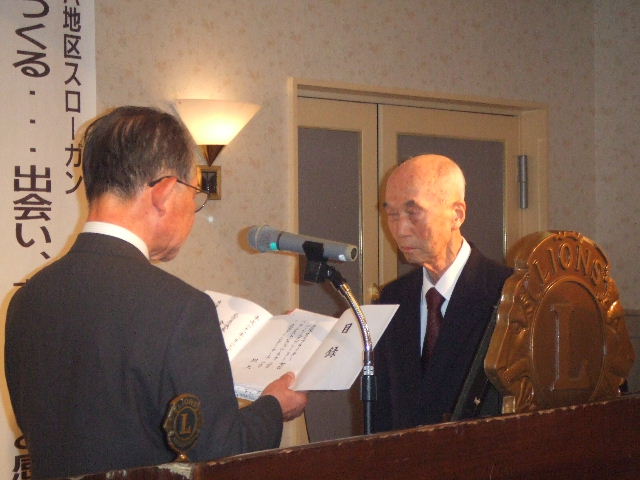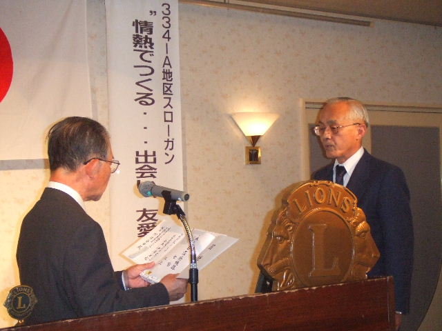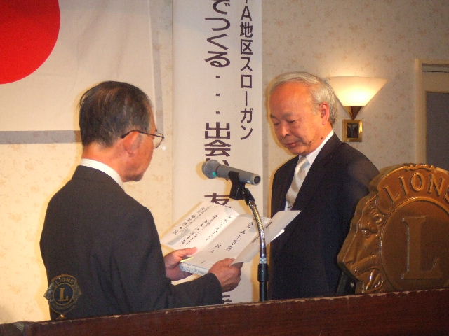 開会のゴングでは、飛田ライオンが立ち、世界的な大不況の中、アメリカが大きな決断をしたこと、それは大きな変化を望んだ結果であると。ライオンズも変化が必要ではないか、そして、本日のゲストの紹介があり、千種区小中学校校長会会長にはAED7台(千種区の中学校7校分)を、上野小学校にはビオトープに50万円を、東海地区入試点訳事業団には弱視の人の入試を助ける点字用のタイプライター一式をそれぞれCN40周年記念アクティビティとして贈呈されました。お三人の方から感謝の言葉があり、会員一同とてもすばらしいアクティビティが出来たことを確認でき、とても幸せな気分になりました。